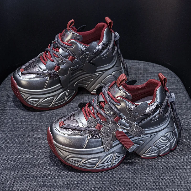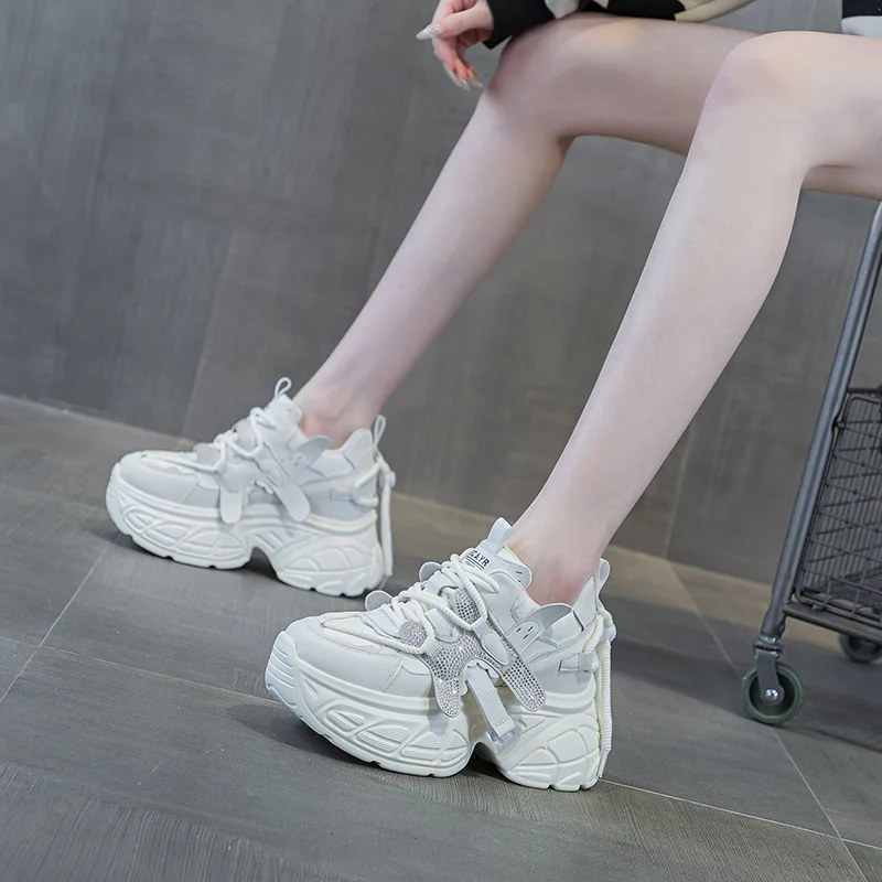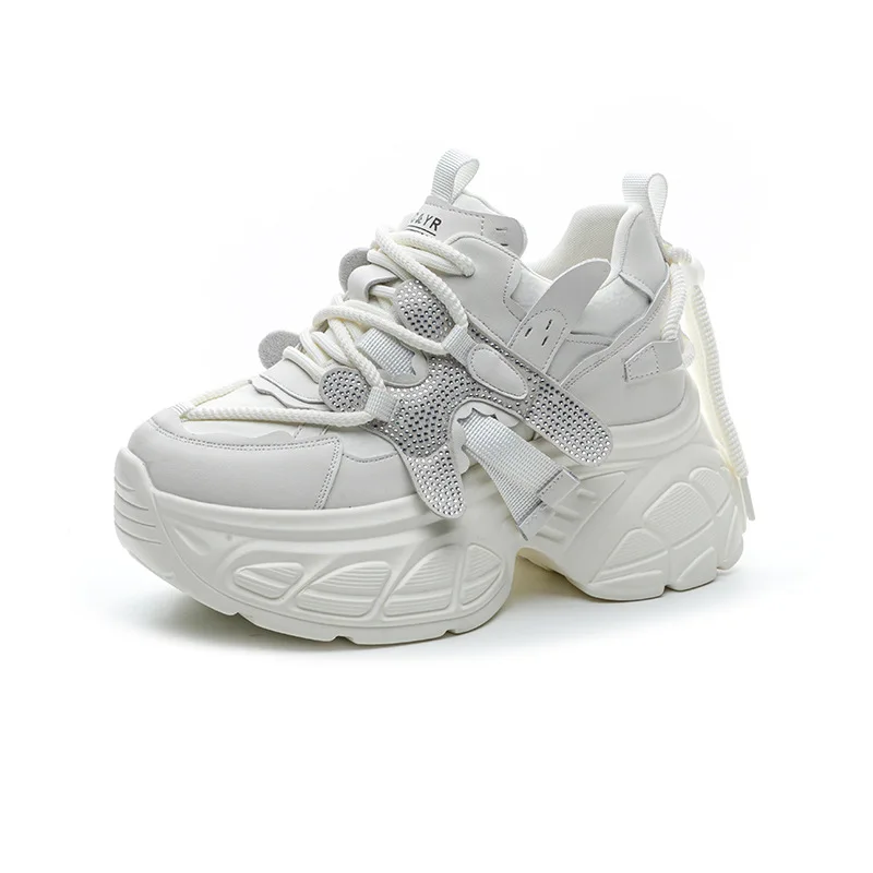 High Quality Leather Thick Soled 9CM Women's Shoes, Women's 2026 Spring New Mesh Rhinestone Casual Sports Shoes